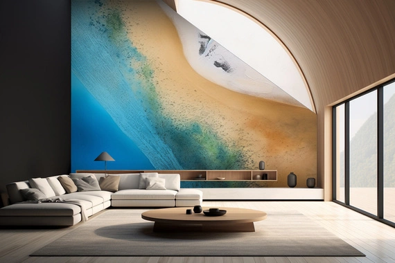 Fascynująca kompozycja naturalnych tekstur i kolorów. Niebieska barwa wody przechodzi w krystaliczne odcienie turkusu, gdzie spotyka się z delikatnym, złocistym piaskiem. Różnorodność barw i faktur tworzy dynamiczne przeciwstawienie - od spokojnego błękitu oceanu, przez ożywione zieleń i brąz laguny, aż po niezmącone biel i szarość fragmentów, które mogą być odbiciem skalistych wysepek lub piaszczystych wydm. Ten wzór przypomina o niezwykłej różnorodności i pięknie przyrody, przyciągając uwagę subtelnością i harmonią kolorów.