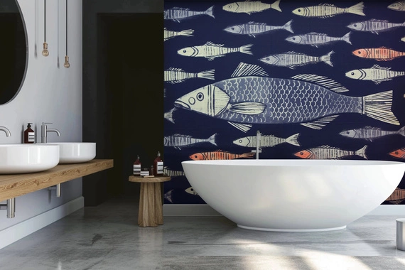 Dynamiczną kompozycję ryb w stylu, który przypomina technikę linorytu. Tło jest głębokiego, satynowego czarnego koloru, co wydobywa ryby o zróżnicowanych wzorach i rozmiarach, dając im wrażenie wyróżnienia się z otchłani oceanu. Jedna duża ryba zajmuje centralne miejsce na płótnie, a jej sylwetka z wyróżniającymi się białymi łuskami staje się punktem centralnym. Wzory na rybach są stylizowane i uproszczone, z akcentami kolorystycznymi w jaskrawych odcieniach, które nadają charakteru i indywidualności każdej z nich.
