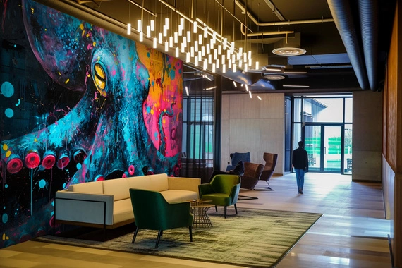 Eksplozja barw, będąca śmiałym połączeniem chaosu i porządku. Ta wielowymiarowa kompozycja przedstawia ośmiornicę ożywioną za pomocą intensywnych, kontrastujących barw i dynamicznych smug. Ciemne tło wzoru podkreśla głębię sceny i pozwala na wyraziste wybicie się postaci ośmiornicy, która wydaje się niemal płynąć przez płótno. Złociste oko stwora, pełne misternej głębi, przyciąga wzrok i zaprasza do kontemplacji. Tańczące plamy i krople farby dodają dziełu lekkości i spontaniczności, jednocześnie tworząc wrażenie ruchu i energii. Rozlewające się po powierzchni kształty i linie tworzą harmonię w tej wyjątkowo dynamicznej i żywej kompozycji. Mural ten jest świadectwem zarówno potęgi natury, jak i nieskrępowanej ludzkiej kreatywności.