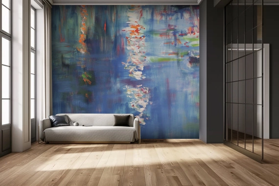 Ten wzór to pełne życia i kolorów przedstawienie podwodnego świata, w którym złociste karpie koi pływają z gracją wśród zanurzonych kwiatów i roślin. Ich łuski migocą w przeróżnych odcieniach pomarańczy i bieli, tworząc żywy kontrast z głębokim błękitem wody. Ożywająca paleta barw przyciąga oko i wprowadza widza w hipnotyzujący, wodny raj. Czerwień kwiatów rozkwitających pod wodą dodatkowo wzbogaca kompozycję, przynosząc ciepło i dynamizm do tej podwodnej sceny. Całość jest harmonijnym połączeniem natury i artystycznego wyrazu, gdzie każdy szczegół, od pęcherzyków powietrza po subtelną grę światła na powierzchni wody, jest świadomie umiejscowiony, tworząc wspaniałą, prawie oniryczną atmosferę.