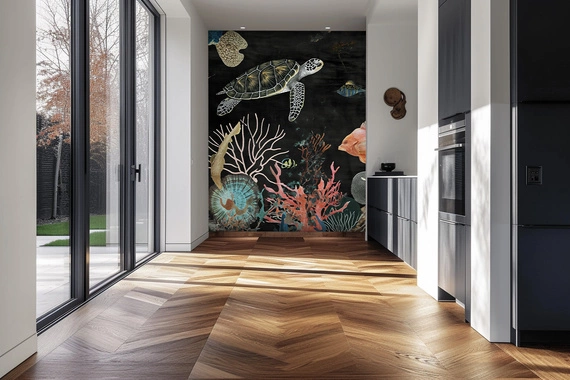 Artysta przenosi nas do serca podwodnego raju, gdzie różnorodność życia morskiego jest ukazana w pełnej krasie. Żółwie morskie o misternie przedstawionych pancerzach płyną wśród bogatej fauny i flory rafy koralowej. Kolorowe ryby przemierzają ciemne wody, ich ciała zdobią paleta żywych barw i wzorów. Szczegółowe przedstawienie koralowców i roślin morskich w różnych odcieniach czerwieni, różu, zielonego i błękitu tworzy tło pełne życia i tekstury. Kontrastujący ciemny tło z jasnymi, żywymi kolorami podkreśla dynamiczny i złożony ekosystem morski. Ten mural jest jak okno do innego świata, pełnego tajemnic i naturalnego piękna, zapraszającego widza do zgłębienia tajników oceanicznych głębin.