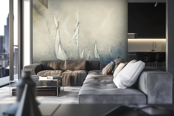 Żaglówki, które niczym duchy przemierzają mleczne morza w atmosferze mgły i marzeń. Subtelne kontury łodzi z białymi żaglami są ledwie zaznaczone na tle, które przypomina starą, rozmytą fotografię lub obraz zanikający we mgle wspomnień. Całość jest utrzymana w tonacji przygaszonych bieli i szarości, co nadaje kompozycji spokojny i niemal oniryczny charakter. Ten mural może przywodzić na myśl wczesne poranki na spokojnym morzu lub wspomnienia z żeglarskich przygód, które z czasem stały się mgliste i poetyckie. Jest to dzieło, które z jednej strony oddaje piękno i spokój żeglugi, z drugiej zaś – niematerialną naturę czasu i pamięci.