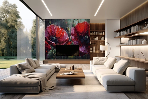 Obraz przedstawia żywy widok pełnych rozkwitu czerwonych maków na tle ciemnym i fakturalnym, które sprawia wrażenie deszczowej atmosfery. Maki są namalowane w odważnym, ekspresyjnym stylu z grubymi pociągnięciami pędzla i bogatą paletą czerwieni - od jasnego szkarłatu do głębokiego burgundu. Światła i cienie są dramatycznie skontrastowane, dodając trójwymiarowego efektu płatkom. Rozpryski farby i użycie kolorów o wysokim kontraście zwiększają dynamiczny, niemal abstrakcyjny charakter pracy. Zielone pąki i łodygi mają bardziej stonowaną tonację, zapewniając uspokajającą równowagę dla żywych czerwieni. Całkowita kompozycja jest zarówno pełna życia, jak i elegancko chaotyczna, uchwycenie esencji piękna natury w stylizowany, malarski sposób.