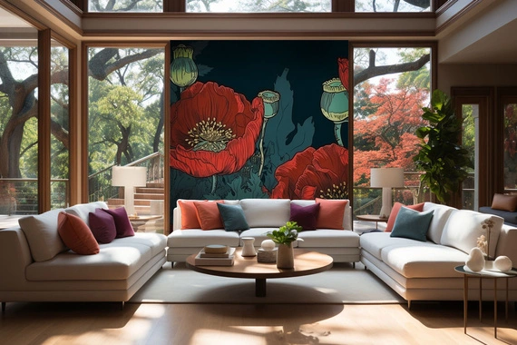 W tym artystycznym muralu, maki wyłaniają się z nocnej otchłani, malowane w delikatnych, nostalgicznych odcieniach vintage. Kompozycja emanuje mistyczną aurą, jakby kwiaty snuły opowieść o tajemniczych nocnych przeżyciach. To jak obraz z innej epoki, w którym magia natury splata się z melancholią nocy.