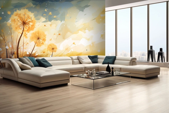 To mural, gdzie złociste mniszki tańczą na wietrze, unosząc się w powietrzu jak swobodne duchy. Ich delikatność splata się z oślepiającym blaskiem porannego słonca, które oświetla każdy detal. Dmuchawce stanowią most między ziemią a niebem, jakby przenosiły marzenia w nowy dzień. To obraz pełen życia, lekkości i magii, który przenosi nas w świat poezji natury.