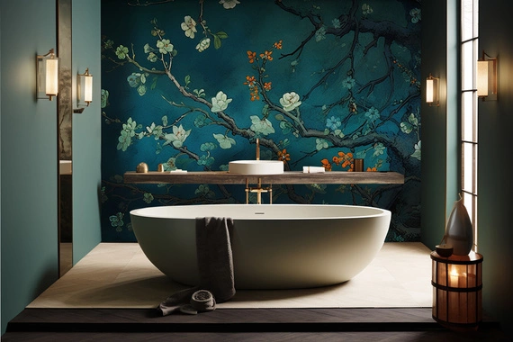 Na tym ujmującym muralu artystycznym, odczuwamy inspirację sztuką japońską. Drzewo jabłoni wznosi się dumnie, porośnięte delikatnymi pąkującymi kwiatami, które zachwycają swą bielą i subtelną pomarańczą. W tle rozciąga się nieboskłon o zachodzącym srebrzystym księżycu, malującym nocne niebo w magiczne odcienie. To jakbyśmy przebywali na skraju snu i jawy, gdzie natura wplata się w tkaninę nieba, tworząc niezwykłe i spokojne arcydzieło japońskiej sztuki.