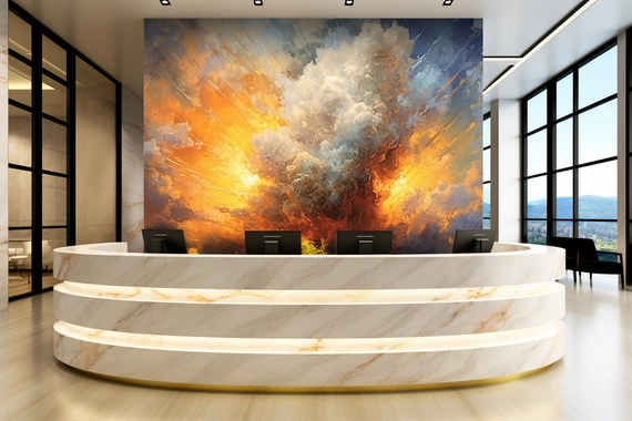 W obliczu tego monumentalnego dzieła sztuki, dusza zatrzymuje oddech, wpatrując się w pulchne fale dymu, które unoszą się ku niebu jak płomienne złoto. To jakby symfonia chaosu i harmonii, ukazana na płótnie w najbardziej eksplozyjny sposób. W sercu kompozycji rozpala się potężny wybuch, jakby serce samej natury wybuchało energią. Dym unosi się ku niebu, jak wulkaniczna erupcja, otaczając się blaskiem promieni słonecznych. To wybuchające centrum emanuje ognistym pomarańczem i żółcią, jak piekielny taniec, który wyłania się z głębin wszechświata. Ogień rozlewa się jak płomień w prądach wiatru, tworząc niezwykłe kompozycje w kształtach płomieni i żaru. Ich języki tańczą i drgają, jakby to były żywe istoty, które wyrywają się ku niebu, poszukując wolności. Dym, w swoim majestatycznym tańcu, przeplata się z ogniem, tworząc niezwykłe wzory i formy, które poruszają się jak zaczarowany taniec. Ich wewnętrzna biel błyszczy, jakby były to duchy, które emanują z samego źródła eksplozji. Kolory na płótnie odzwierciedlają kosmiczną siłę tego wybuchu. Pomarańcz i żółć wibrują z intensywnością, przynosząc na myśl gorący wrzątek i promieniste słońce. Kontrastują one z ciemniejszymi odcieniami dymu, tworząc niezwykłą harmonię pomiędzy światłem a ciemnością. Ten mural to manifestacja nieokiełznanej mocy natury, która w jednej chwili może wybuchnąć w wielkim spektaklu energii i życia. To przypomnienie, że nawet w najbardziej eksplozyjnych chwilach istnieje miejsce na piękno i transcendencję.