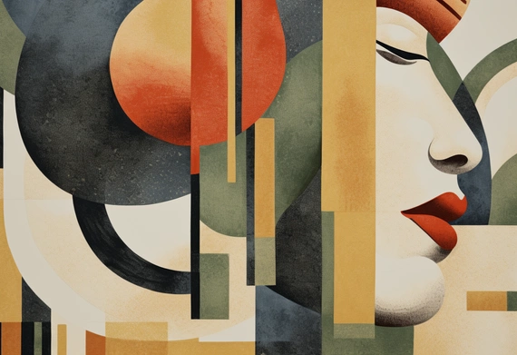 Chignon MC119 przedstawia artystyczny portret kobiety z profilu, wykonany z figuralnych elementów geometrycznych, które nadają mu abstrakcyjny charakter. Cała kompozycja jest pełna wyrazistych kolorów, które przyciągają wzrok i tworzą interesujący efekt wizualny. Na tle tapety widzimy profil kobiety z czarnymi włosami spiętymi w elegancki kok. Jej twarz jest zaznaczona poprzez prostokątne pasy w kolorze zielonym i żółtym, które przecinają się, nadając twarzy unikalny charakter. Zaznaczają one kontury jej policzków, nosa i brwi, a także akcentują jej usta.