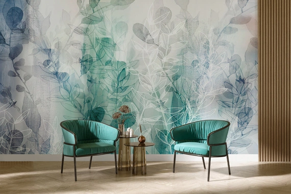 Ilustracja przedstawia delikatną kompozycję roślinnych gałązek w odcieniach zieleni, błękitu i subtelnych pasteli. Liście są przedstawione w różnych stopniach przezroczystości, co tworzy efekt warstwowości i głębi. Tło jest rozmyte, w tonacjach jasnych kolorów, które współgrają z roślinami, tworząc spokojną i eteryczną atmosferę. Całość wygląda jak akwarelowe malowidło, pełne subtelnych detali, które nadają obrazowi lekkości i spokoju.