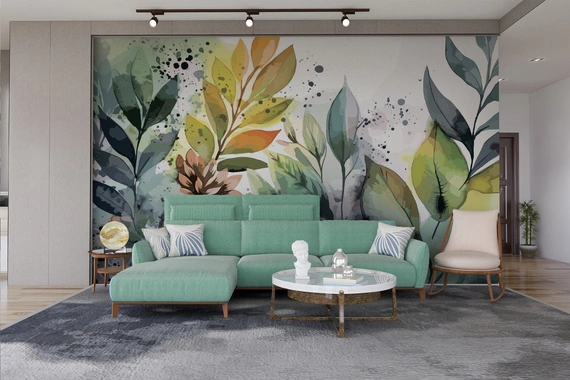 Ilustracja przedstawia kolorową kompozycję liści wykonaną w stylu akwarelowym. Liście w różnych kształtach i rozmiarach mają odcienie zieleni, żółci, błękitu i brązu, a tło ozdobione jest rozpryskami farby i miękkimi przejściami kolorystycznymi. Obraz ma lekki, artystyczny charakter i przypomina dzieło malarskie, emanujące świeżością natury i dynamiką ruchu. Idealna ilustracja do projektów związanych z przyrodą, ekologią lub designem wnętrz.