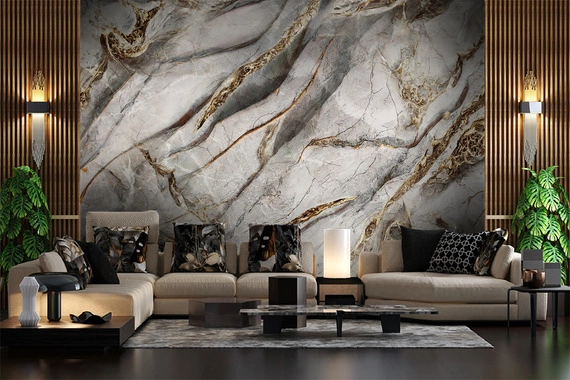 Obraz przedstawia strukturę naturalnego kamienia – marmuru o złożonym, dynamicznym układzie żył. Dominuje paleta szarości przełamana ciepłymi tonami złota, brązu i subtelnych bieli. Wzory mają organiczny, niemal płynny charakter, przypominając pęknięcia, żyły oraz warstwy geologiczne uformowane przez naturę. Tekstura jest elegancka, luksusowa i pełna głębi, co sprawia, że powierzchnia wydaje się trójwymiarowa i pełna ruchu.