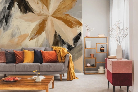 Obraz przedstawia abstrakcyjną kompozycję w odcieniach beżu, brązu, szarości i czerni. Pociągnięcia pędzla układają się w dynamiczne, przypominające liście lub płatki formy, które rozchodzą się promieniście z centralnych punktów. Całość sprawia wrażenie ruchu i lekkości, a zastosowana paleta barw nadaje pracy ciepły, jesienny charakter. Styl obrazu nawiązuje do ekspresjonizmu abstrakcyjnego, podkreślając energię i emocje zawarte w geście malarskim.