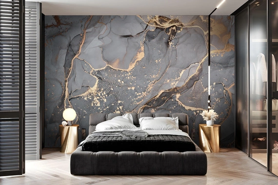 Obraz przedstawia abstrakcyjną kompozycję w odcieniach szarości z wyraźnymi złotymi akcentami. Całość przypomina marmurową powierzchnię z efektownymi żyłkami i smugami, które tworzą organiczne, płynne kształty. Złote elementy, wyglądające jak rozpryski farby lub złoty pył, dodają luksusowego charakteru i głębi. Styl pracy łączy elegancję z nowoczesną estetyką, doskonale nadając się jako dekoracyjny element wnętrz inspirowanych naturą i sztuką współczesną.