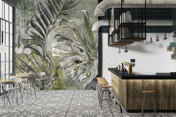 Obraz przedstawia artystyczną kompozycję inspirowaną naturą, w której dominują rysunkowe liście tropikalnych roślin. Tło utrzymane jest w odcieniach zieleni i szarości, przypominających strukturę betonu lub postarzanego papieru. Liście mają wyraźne kontury i cieniowania, co nadaje im dynamiczny, niemal trójwymiarowy wygląd. Całość tworzy harmonijną, dekoracyjną ilustrację o botanicznym charakterze, idealną do wykorzystania jako wzór na tapetę lub tekstylia.