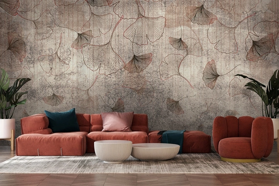 Ilustracja przedstawia artystyczną kompozycję z liśćmi ginkgo, które są rozrzucone na tle przypominającym starą, zużytą drewnianą deskę. Liście są delikatnie zarysowane cienkimi, czerwonymi i brązowymi liniami, co dodaje obrazowi subtelności i elegancji. Tło jest w odcieniach szarości i beżu z widocznymi śladami zużycia, co nadaje ilustracji vintage'owy charakter. Całość tworzy atmosferę spokoju i nostalgii, idealnie nadając się jako dekoracja w stylu retro lub jako element graficzny w projektach związanych z naturą i historią.