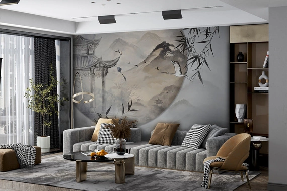 Malarska scena inspirowana tradycyjną sztuką Wschodu. Na pierwszym planie widoczna jest ozdobna pagoda z misternymi detalami architektonicznymi, z której wystaje dzwonek wietrzny. W tle rozciągają się zamglone, miękko malowane góry i pagórki, na których widać sylwetki świątyń i bram torii. W powietrzu szybują żurawie, symbolizujące spokój i długowieczność. Delikatne gałęzie bambusa wprowadzają naturalny rytm kompozycji. Całość utrzymana jest w stonowanych odcieniach szarości, beżu i czerni, tworząc atmosferę ciszy i harmonii.