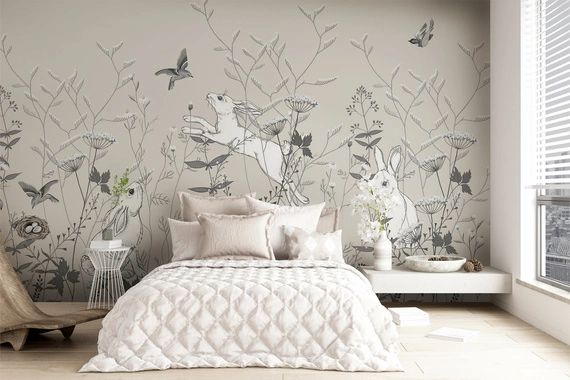 Ilustracja przedstawia scenę zajączków wśród dzikich roślin. Na tle jasnoszarego nieba pojawiają się trzy zające, które bawią się wśród wysokich traw i kwiatów. Jeden z nich skacze, starając się dosięgnąć kwiatka, inny spogląda w stronę nieba, a trzeci siedzi spokojnie. W tle latają ptaki, a na ziemi znajduje się gniazdo. Roślinność jest szczegółowo odwzorowana w delikatnych, stonowanych odcieniach szarości i zieleni, co nadaje całości subtelny i spokojny charakter.