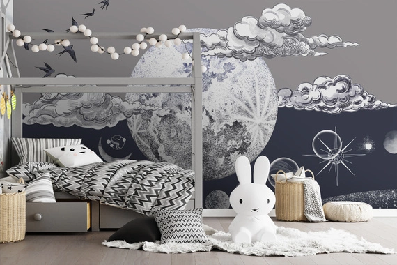 Ilustracja kosmiczna w stylu szkicowym, przedstawiająca ogromny księżyc częściowo zasłonięty warstwami rysunkowych chmur na tle szarego nieba. Wokół niego widać konstelacje gwiazd, spiralne galaktyki, planety z delikatnymi teksturami oraz symbole astronomiczne. W górnej części obrazu lecą stado ptaków. Dominują odcienie bieli, czerni, granatu i szarości, tworząc marzycielski, tajemniczy i fantazyjny klimat nocnego nieba.