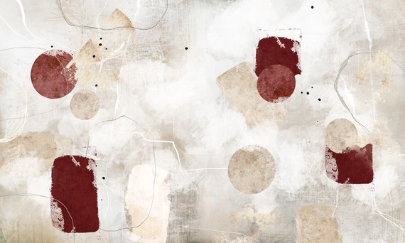 Tapeta „ Rojo” to nowoczesna kompozycja abstrakcyjna, która łączy surową ekspresję sztuki współczesnej z subtelnością naturalnych faktur. Geometryczne formy – koła i prostokąty – zostały rozmieszczone swobodnie na nieregularnym, teksturalnym tle, przywodzącym na myśl warstwowo malowaną ścianę lub płótno artysty. Wyraziste akcenty w głębokiej czerwieni kontrastują z delikatnymi odcieniami beżu i bieli, tworząc efektowną, ale nienachalną dekorację ścienną.