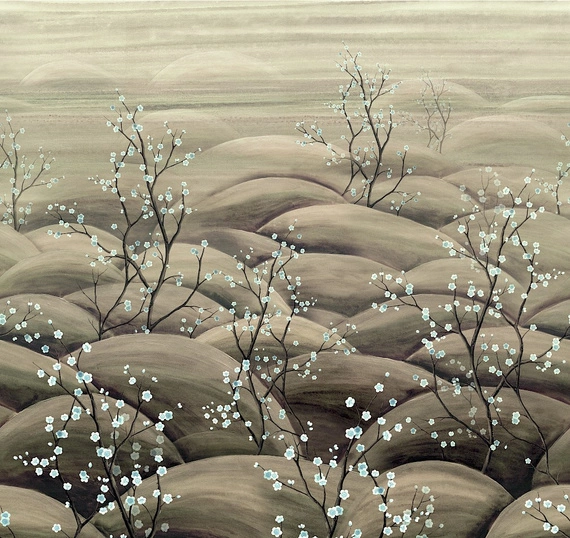 nowoczesne,eleganckie, krajobraz, sakura, góry, japandi
